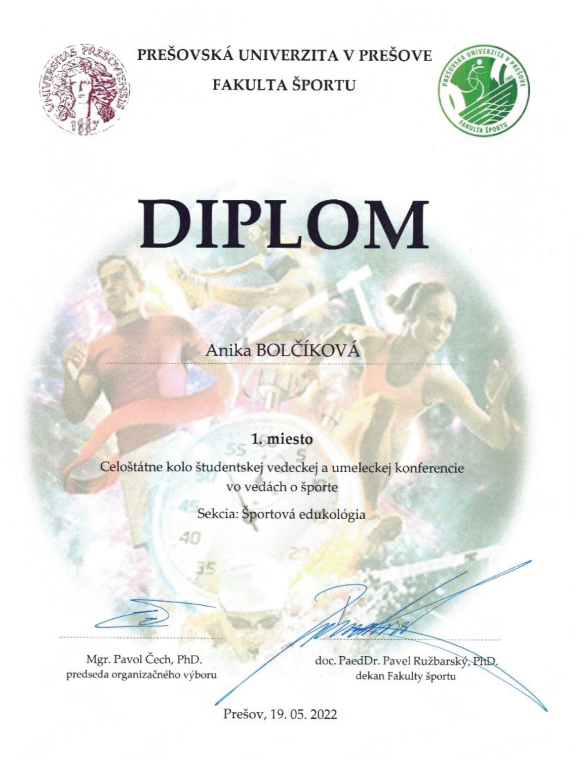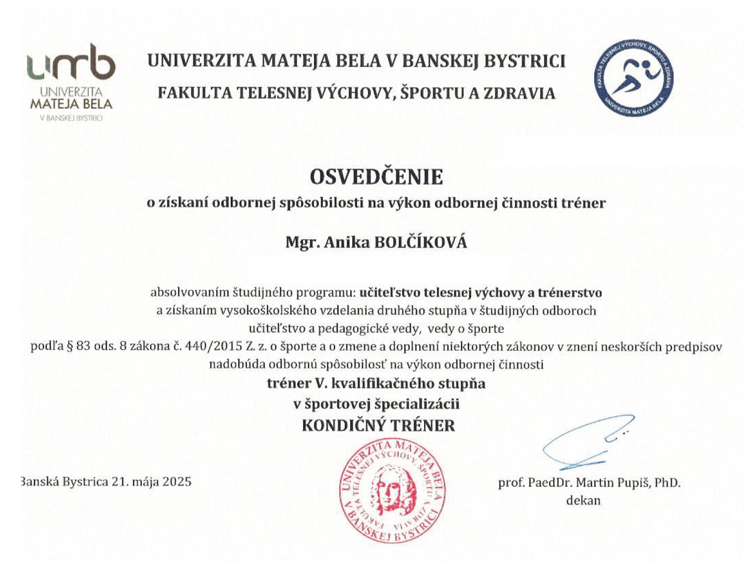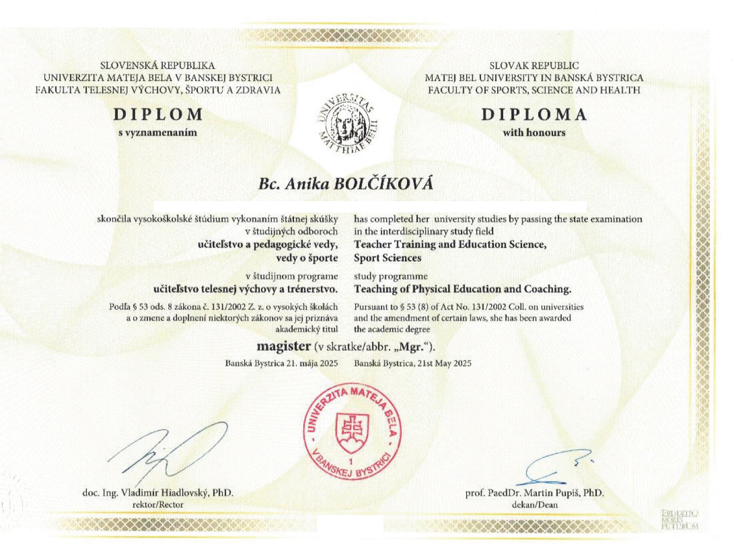 Na univerzitách v USA (AUBURN a následne OLD DOMINION) som študovala Excercise Science. Po dvoch rokoch v zahraničí som začala študovať študijný program učiteľstvo telesnej výchovy a trénerstvo na FTVŠaZ UMB. V roku 2025 som ukončila magisterský stupeň štúdia a získala najvyššiu trénerskú kvalifikáciu v systéme vzdelávania športových odborníkov v rámci krajín EÚ pre výkon odbornej činnosti v športovej špecializácii kondičný tréner.
