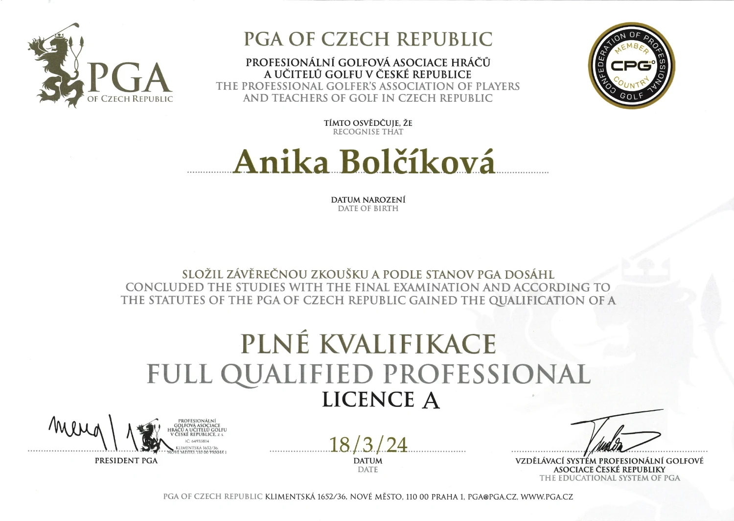 V roku 2023 som úspešne dokončila trojročné štúdium v systéme vzdelávania profesionálnej golfovej asociácie hráčov a učiteľov golfu v Česku. Stala som sa profesionálnou golfovou trénerkou.
